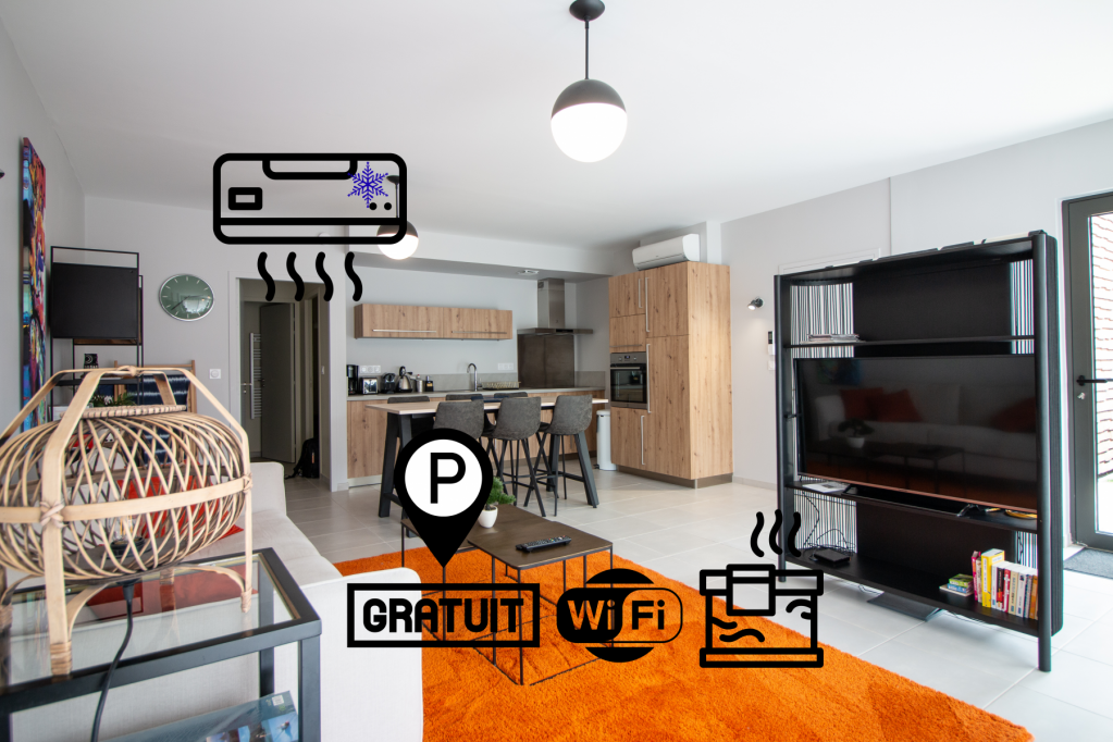 L'appartement est adapté aux personnes à mobilité réduite. Parking privé et gratuit (Borne de rechargement voiture électrique en option)