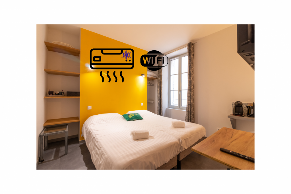 Chambre " La Positive" vous offrira tout le confort dont vous avez besoin grâce à sa climatisation réversible. Vous êtes en quelques pas en plein cœur de Sarlat et de ses animations.
